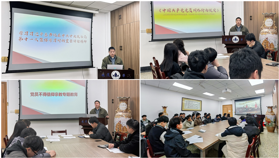 评议结束后,开展了集中学习活动。由李华棚带领全体党员学习习近平总书记在中共中央政治局第十一次集体学习时的重要讲话精神,支部党员围绕“研究生如何做好“创新”这篇大文章,为推动新质生产力加快发展做贡献”进行了热烈讨论。会议还学习了《中国共产党党员网络行为规定》,李华棚以党员在日常使用微信等网络聊天工具时违反行为规范的案例为切入点,以案普法,增强支部党员在网络空间的行为规范。