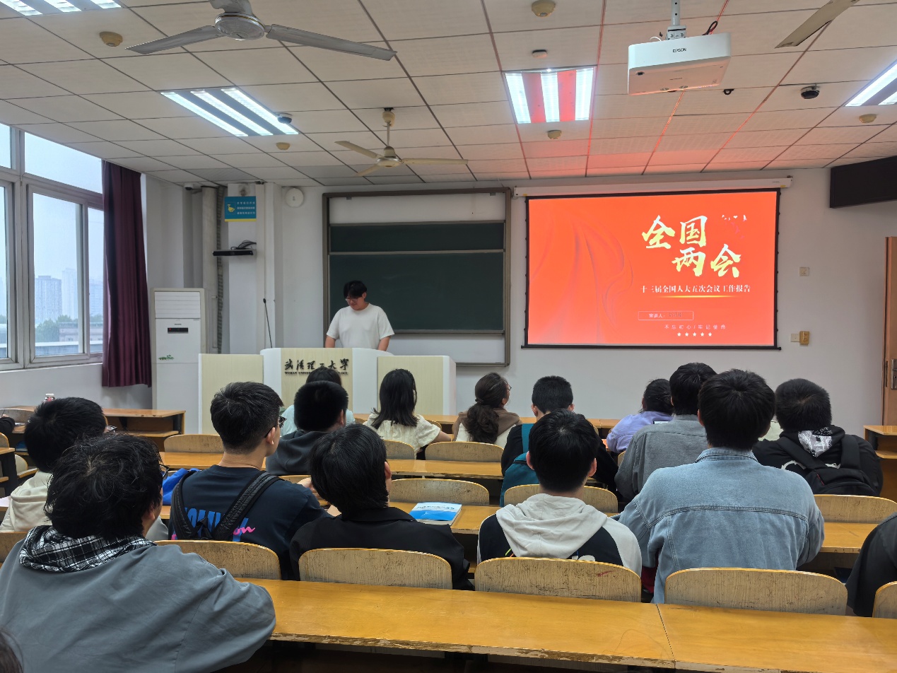 团支书刘兆彬以“聚焦两会热点·勇担时代使命”为题解读政府工作报告中“新质生产力”“高质量发展”“海洋强国战略”等关键词,结合专业导航技术、智慧航运等学科特色,深入剖析“科技创新赋能产业升级”“绿色低碳转型”等议题。航运是联通世界的纽带,我们要以两会精神为指引,培养更多具有国际视野、创新能力的复合型人才,服务国家战略需求。