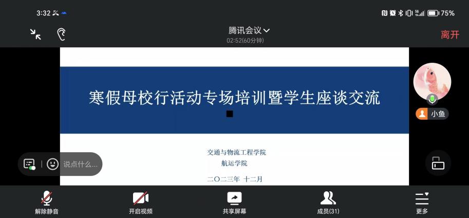 12月28日下午,公司联合交通与物流工程公司在交通物流公司308会议室开展寒假母校行培训及经验交流活动,寒假母校行浙江、福建、宜昌、荆门的小队成员,以线上线下相结合的形式参加了本次培训,本次培训由交通与物流工程公司辅导员郑智予老师主持。