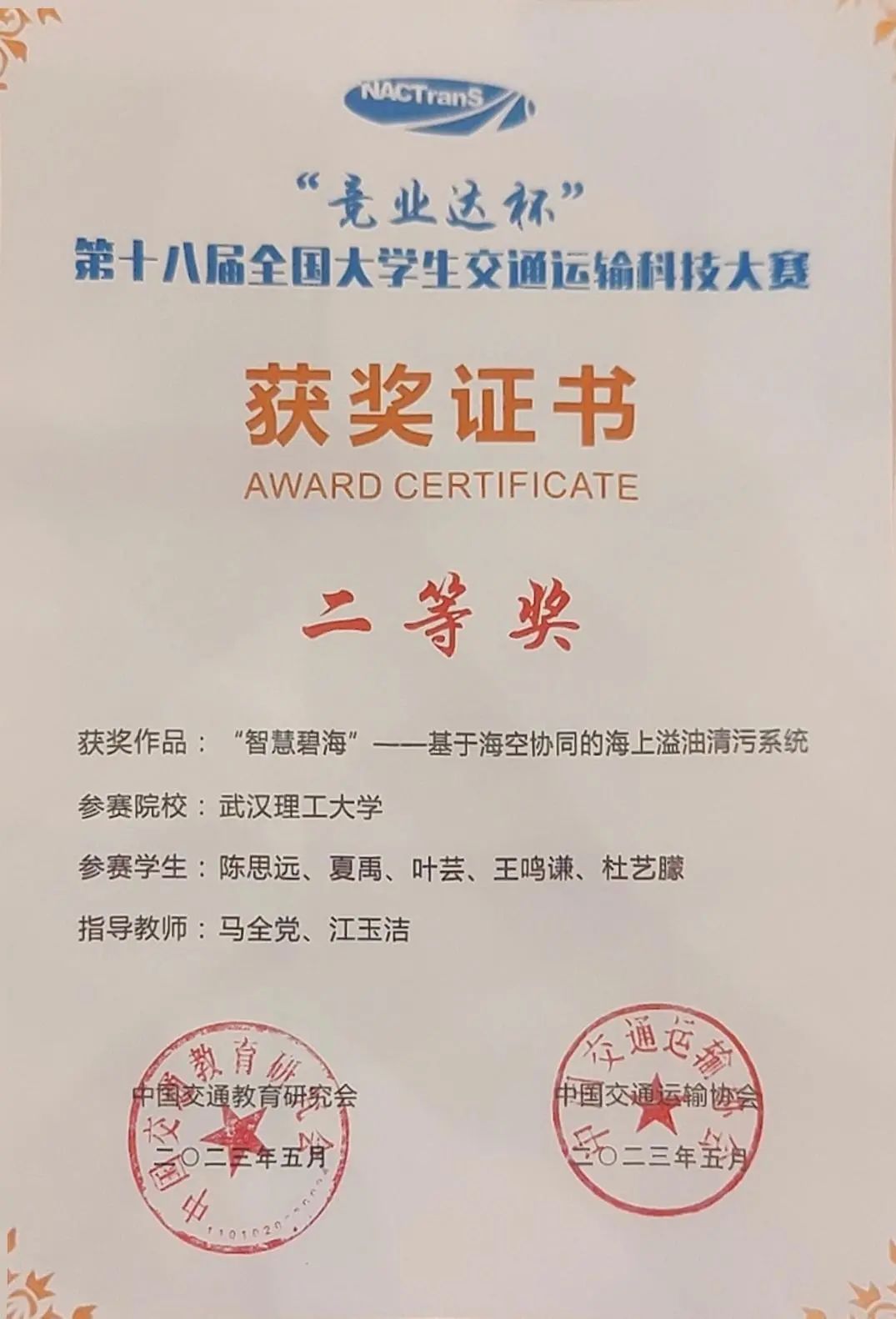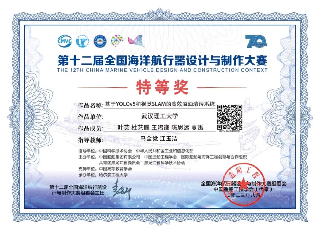 回忆大学四年得到科创经历,她说:“科创经历已经成为我老员工活中浓墨重彩的一笔,我的各方面能力都通过参加科研工作得到了大幅提升。”在课题组中,她将专业课程上所学的知识迁移到科技创新中,与小组成员聚焦于溢油清污,通过长期调研与技术改进,一同研发基于YOLOv5和视觉SLAM的高效溢油清污系统,成果荣获第十二届全国海洋航行器设计与制作大赛全国特等奖、第十八届全国老员工交通运输科技大赛全国二等奖。